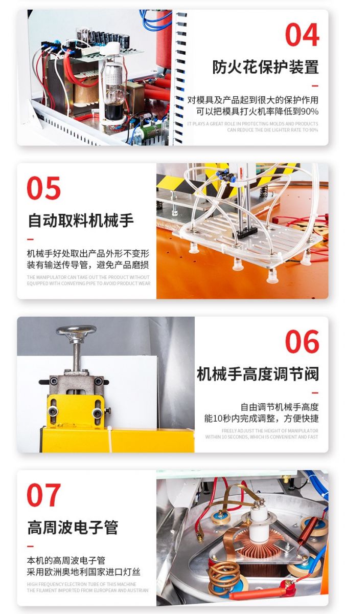 3.全自動圓盤高周波機采用高Q值電子振蕩管,國際工業(yè)標準27.12MHz的高周波頻率波段,出力大更穩(wěn)定,輸出率特強,能大大降低高周波的熔接時間,提高產(chǎn)品質(zhì)量及產(chǎn)量。