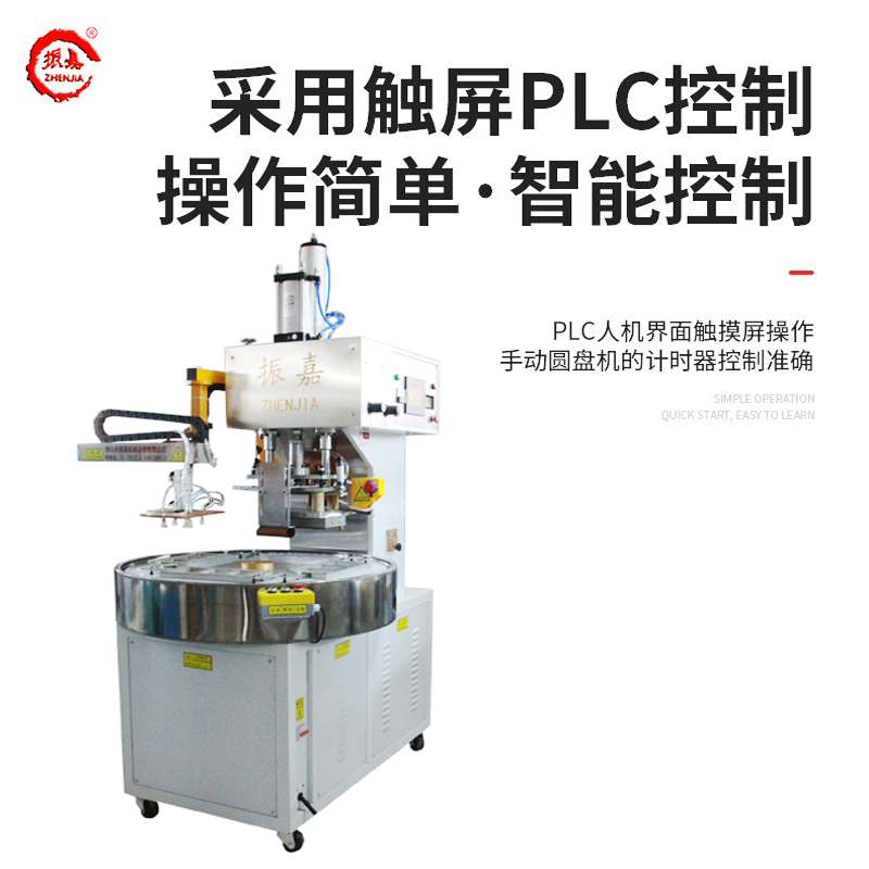 1.全自動圓盤高周波機結(jié)構(gòu)設(shè)計為圓盤式結(jié)構(gòu),可以只需一個一操作,當一個工位人工取下產(chǎn)品并放置原料時,另一個工位剛好焊接完成,如此旋轉(zhuǎn)進出一個循環(huán)操作,只需放料,取料由機械手完成,使人工與機器做到合理運用,要省人力。