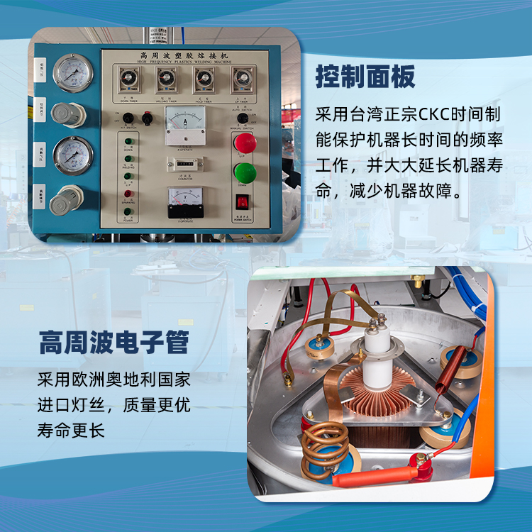 5.單頭同步熔斷機屬高頻設備,其整蕩頻率為27.12 MHz,40.68 MHz符合國際工業(yè)波段標準,高頻由電子管自激振蕩器產生商頻電磁場,使加工塑膠在上下電極間的高頻電場中,其內部分子產生距力運動摩擦,在模具的壓力下得到其熔接目的,熔接效果。