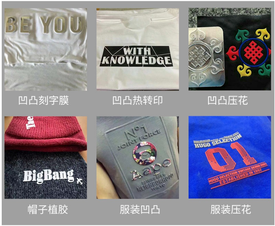 服裝壓花機(jī)適用于各種針織,毛衣,服裝的矽膠壓花,熱轉(zhuǎn)印真皮,商標(biāo)皮的烙印,高溫烙印人造皮革和牛仔的凹凸壓花成型適用于T恤的矽膠壓花,毛衣的矽膠壓花,壓痕各種真皮,商標(biāo)皮的烙印,生產(chǎn)各種液體硅膠的立體商,服裝凹凸壓花機(jī)主要用于服裝壓花、牛仔凹凸壓花、鞋材壓花、商標(biāo)、皮包、運(yùn)動(dòng)鞋、工藝禮品、箱包、牛仔服飾等等。