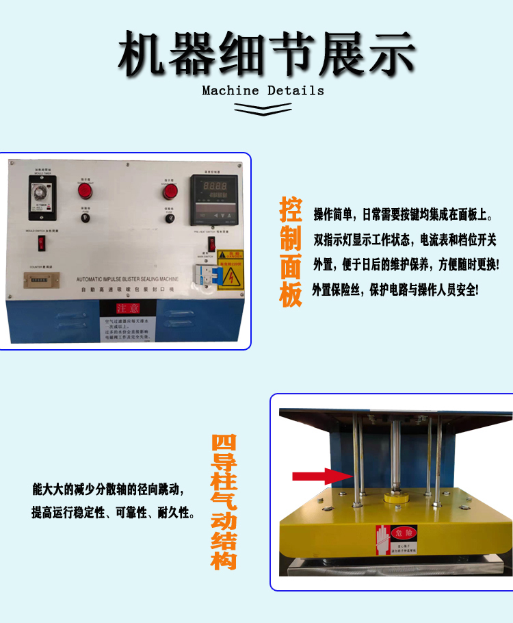 1.兩面紙卡吸塑包裝機(jī)操作簡便:只要選擇延時時間、加熱時間與冷卻時間及加熱電流轉(zhuǎn)換檔位,手動旋轉(zhuǎn)圓盤工作臺,機(jī)器的延時系統(tǒng)、加熱系統(tǒng)及冷卻系統(tǒng)便會自動操作,完成封合過程。